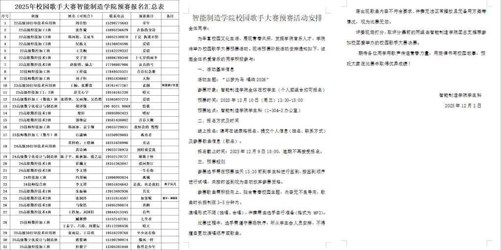 为丰富校园文化生活,展现学子青春风采,发掘学院音乐人才,12 月 10 日,智能制造学院 “以梦为马 唱响 2026” 校园歌手大赛预赛在学院学生科(1-304-2 办公室)圆满落幕。全院热爱音乐的学子齐聚赛场,用深情演绎传递青春力量,用动听旋律书写校园故事,为冬日校园增添了浓厚的艺术氛围。